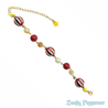 Made of large red and white striped beads, yellow plastic beads, and glass beads that resemble popcorn.