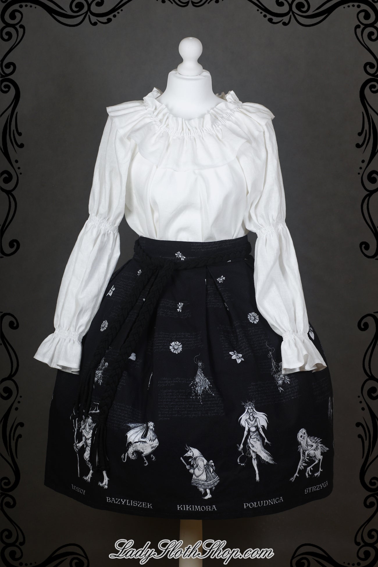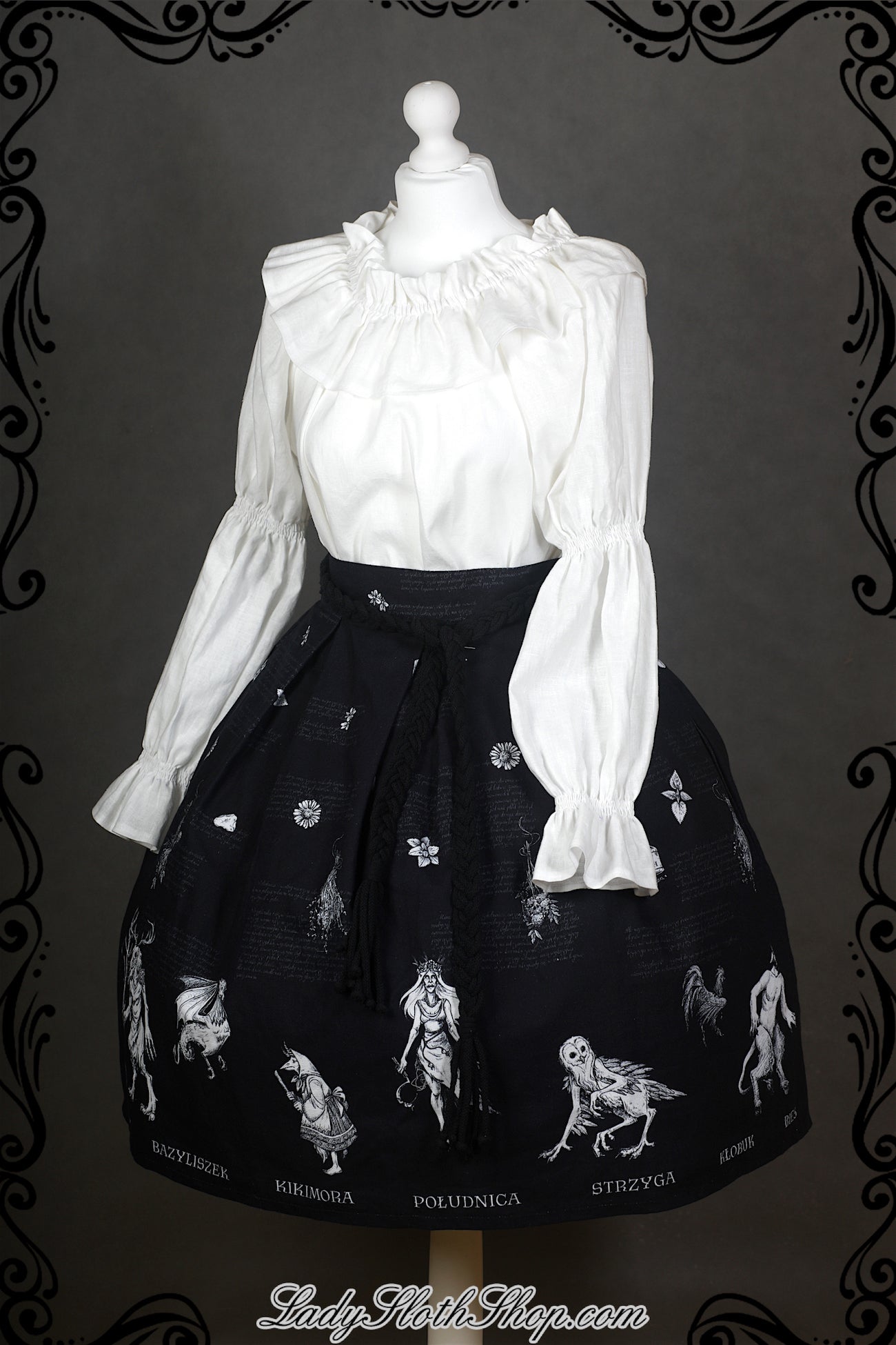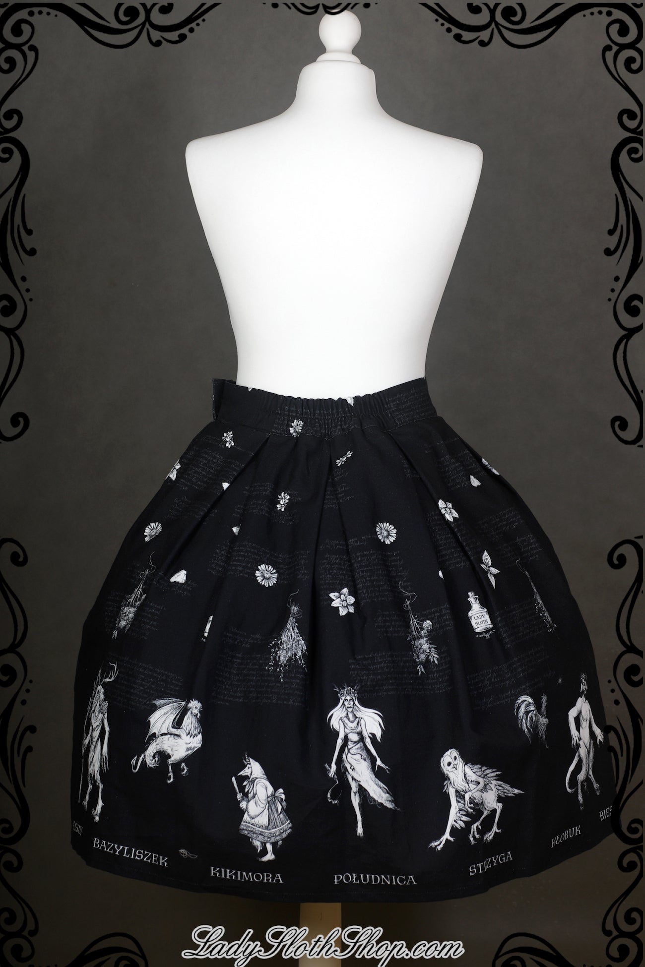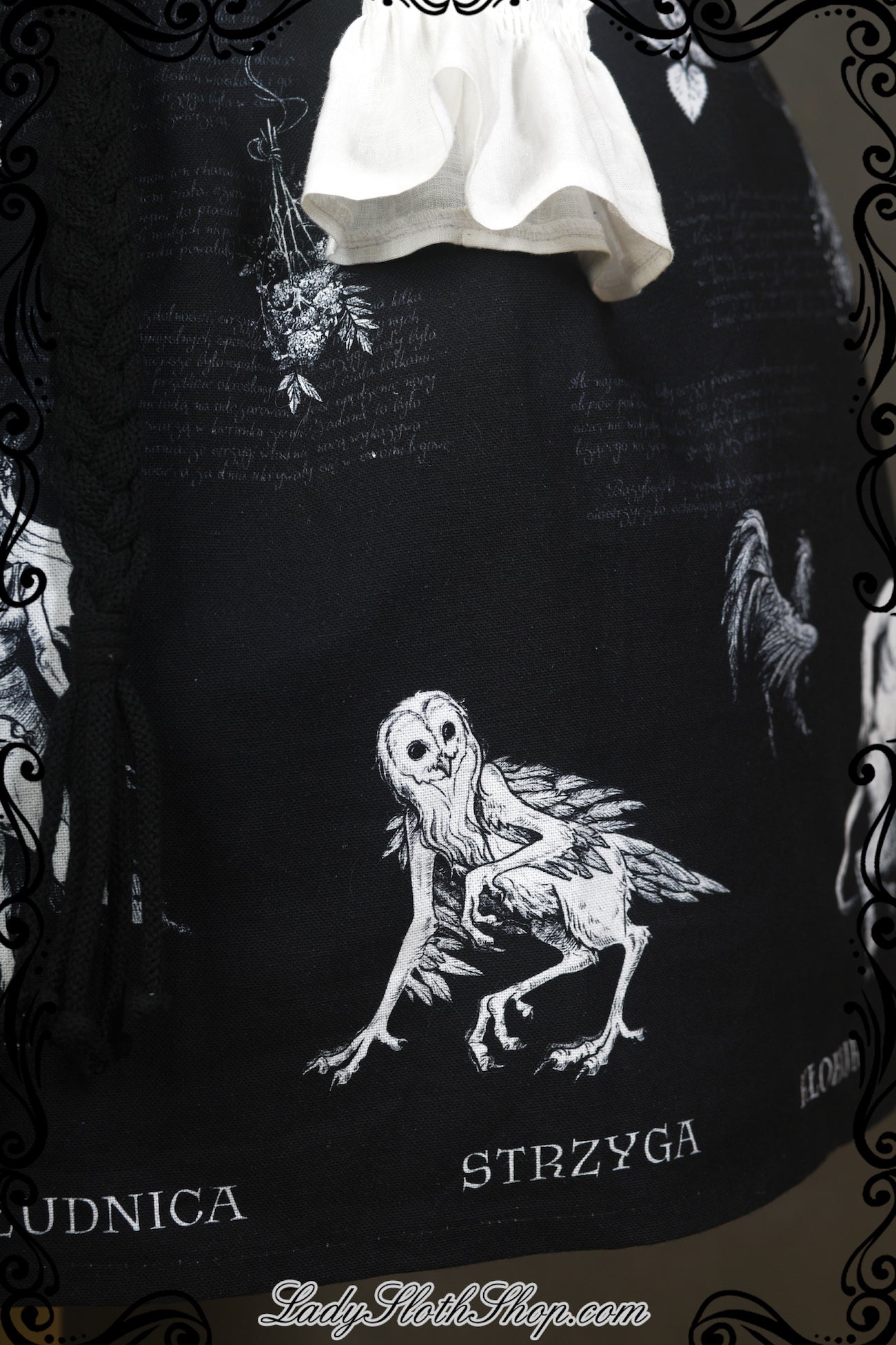 Our original printed series is called ‘Slavic Bestiary’. The print is drawn by our amazing Antygea, and it’s exclusive for Lady Sloth. This collection is inspired by Slavic cultural heritage. The words printed on the dress are in Polish language.