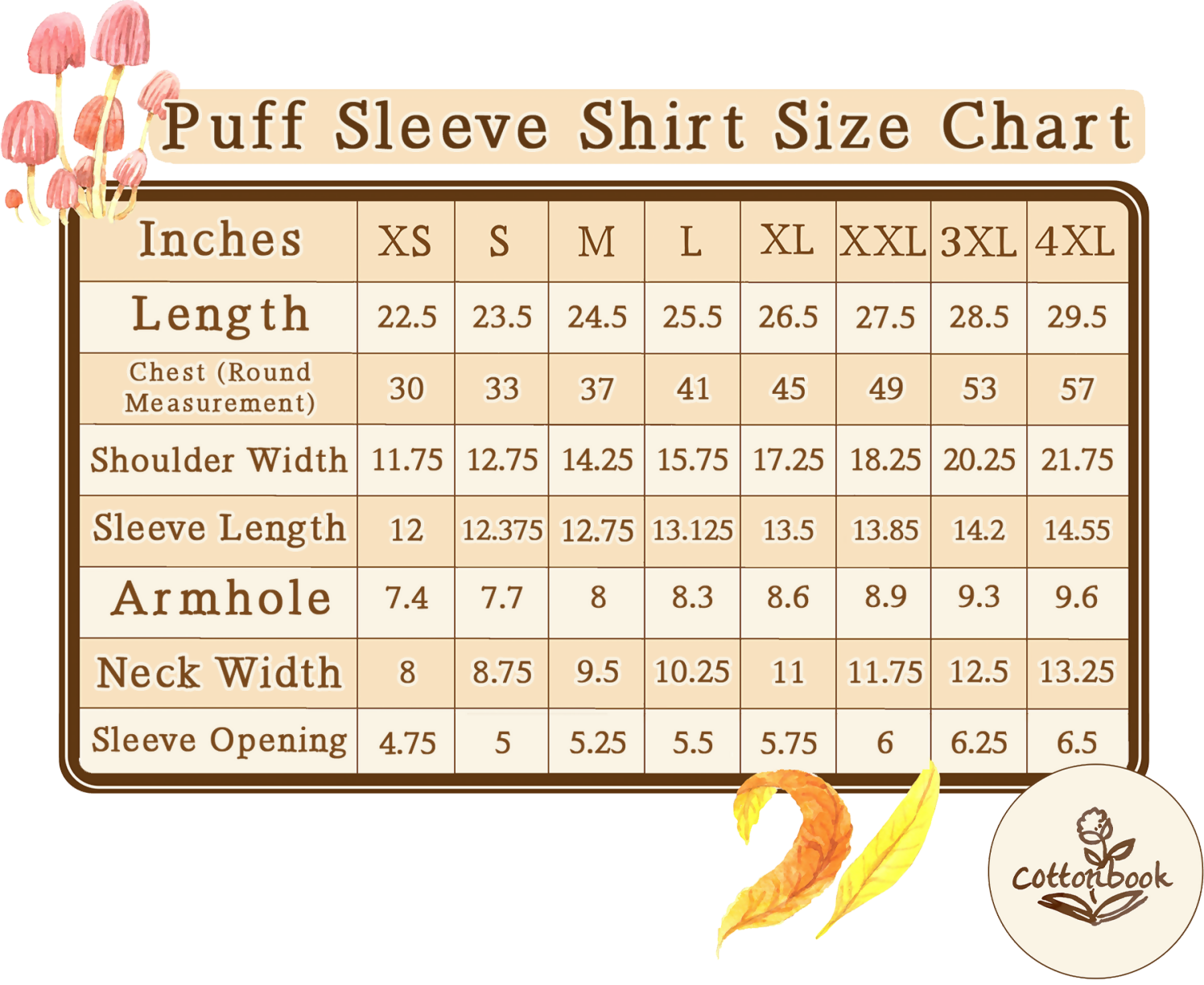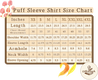 You can refer to the puff-sleeve shirt size chart for detailed measurements. If you're unsure about some of them, you can pick your standard size or base it on the measurement around the chest and the length from shoulder to hem.