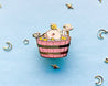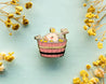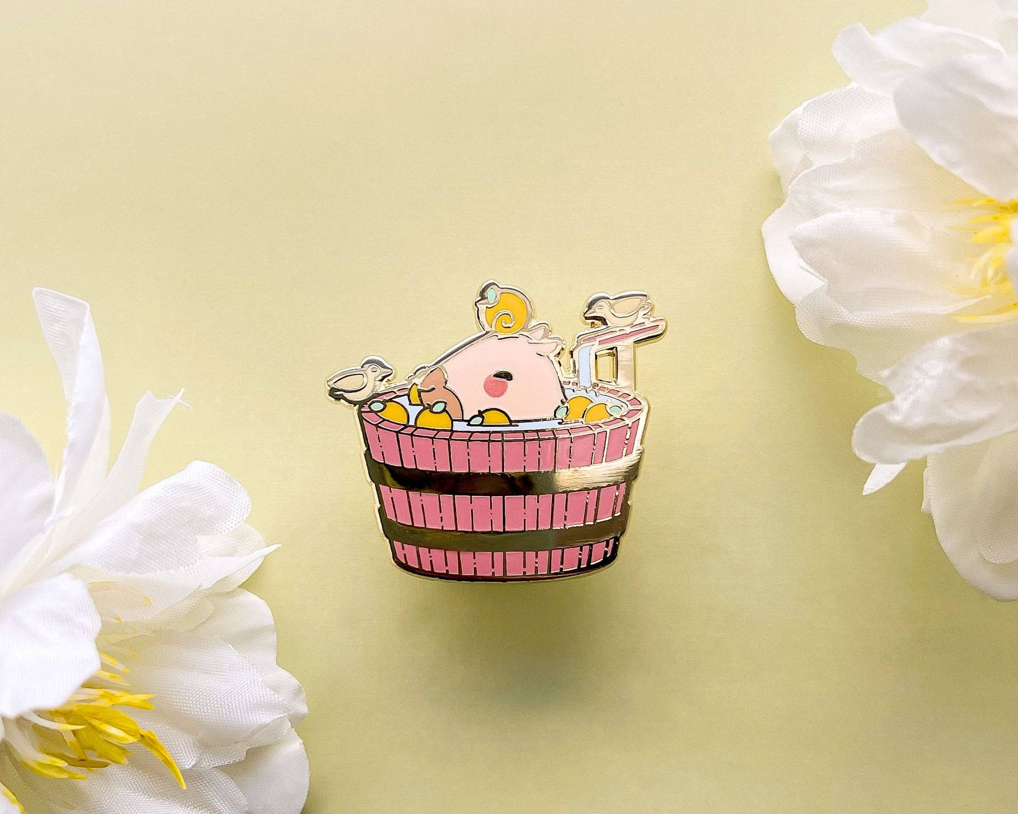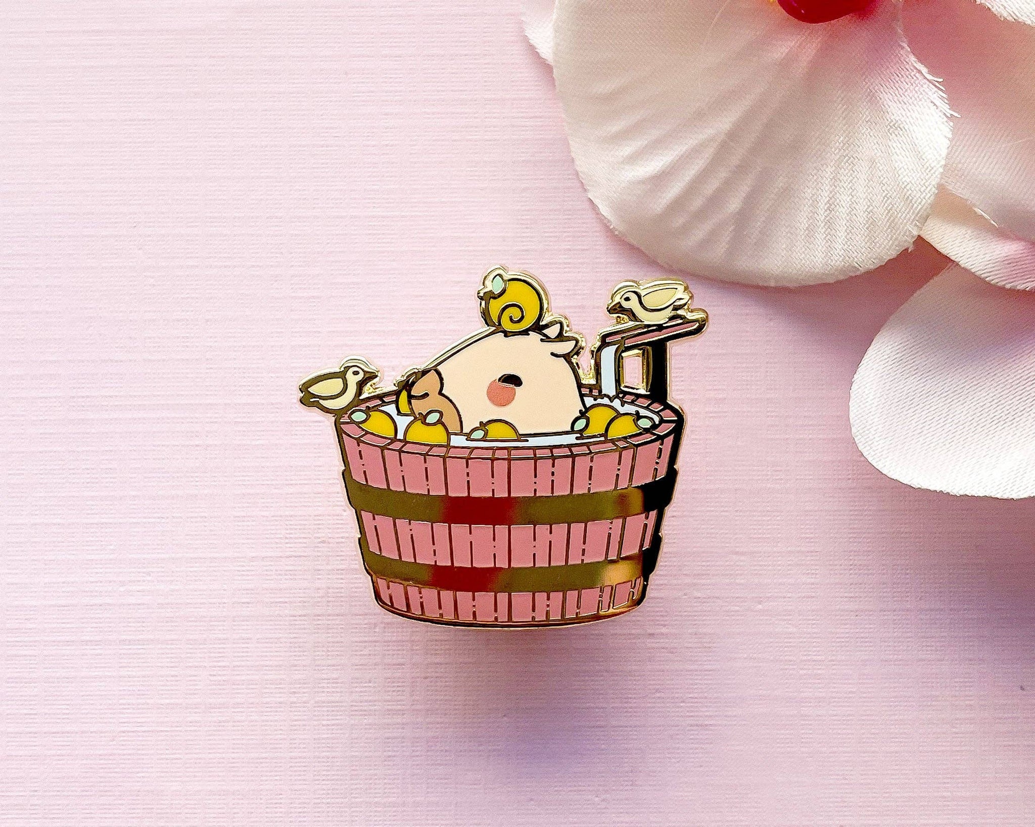 This Curly the Capybara in a Bucket Spa Enamel Pin features my original character, Curly and two of his bird friends enjoying a relaxing bucket spa bath. Curly is my original capybara character who enjoys chilling out in a bucket in the summer or autumn time. This 1.5" hard enamel pin features gold plating, two posts on the back and has a color palette of beige, yellow, brown, blue, orange and pink.