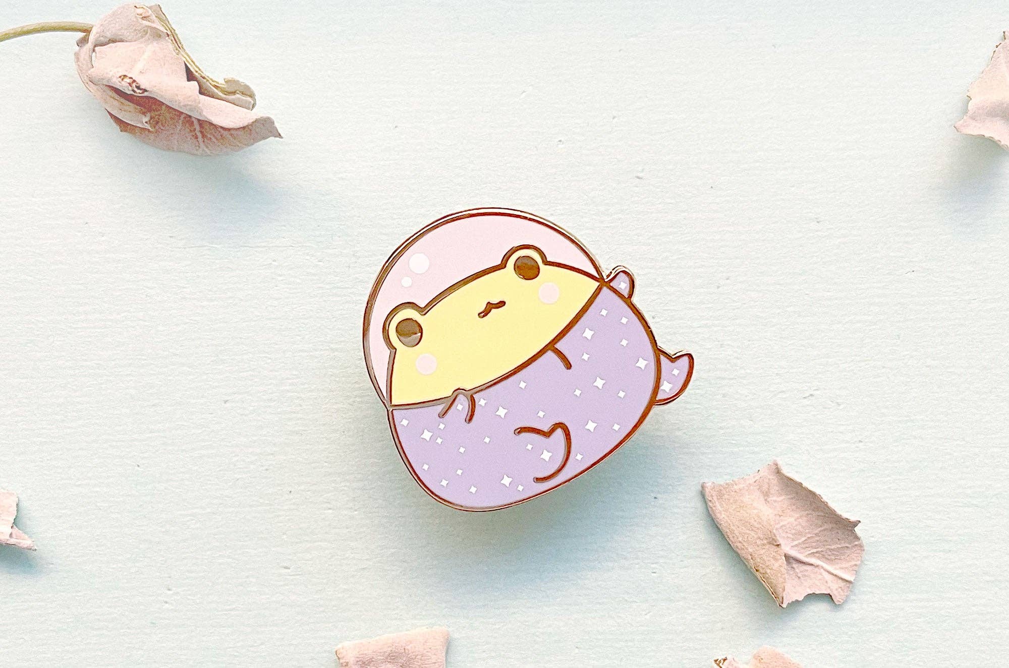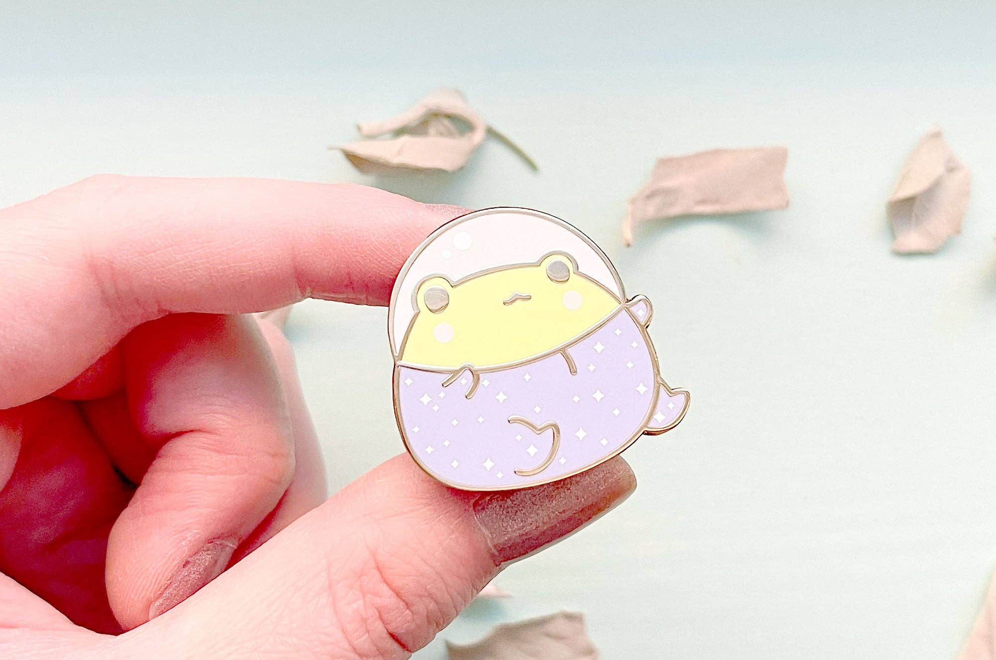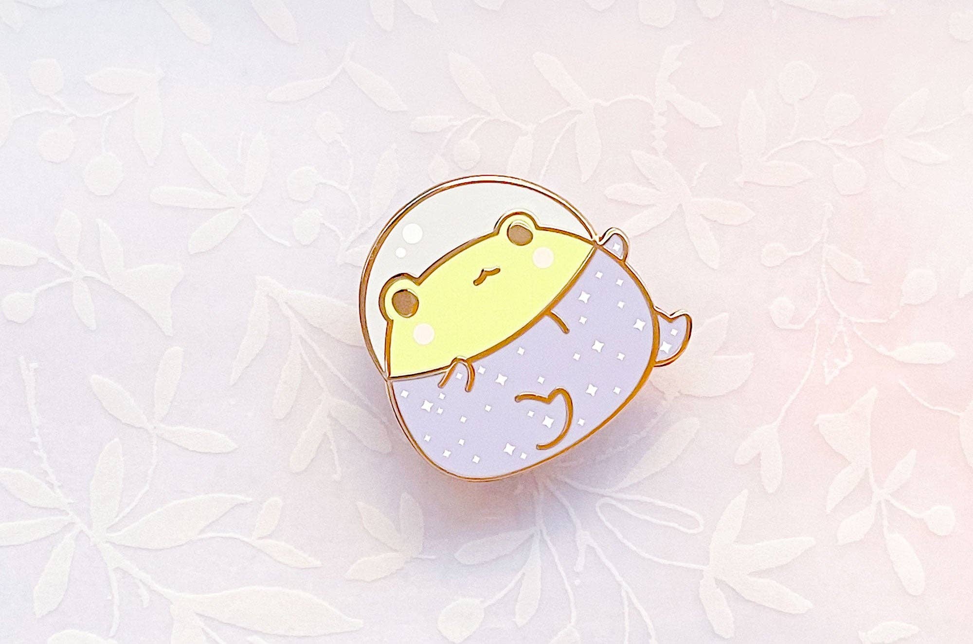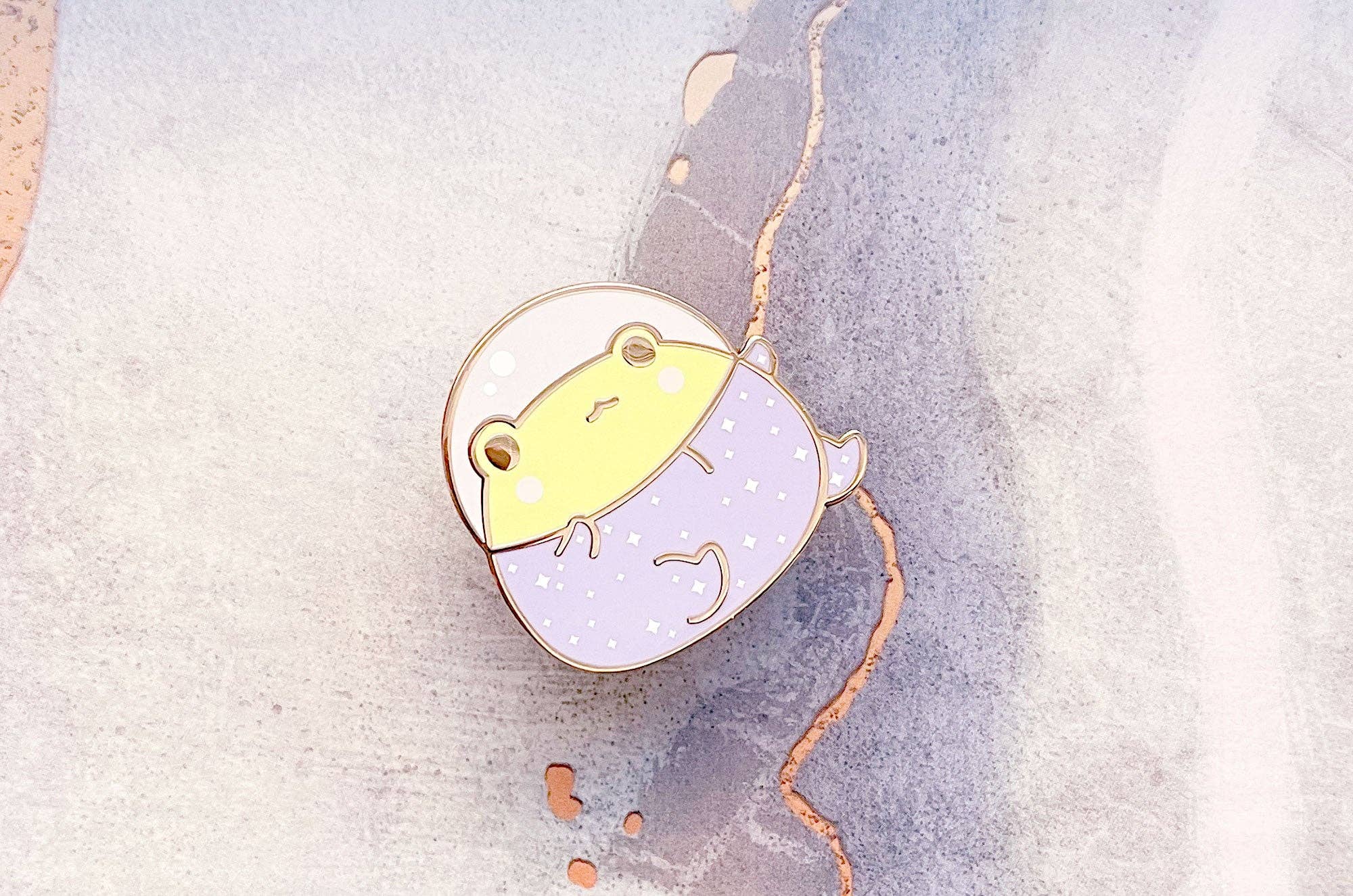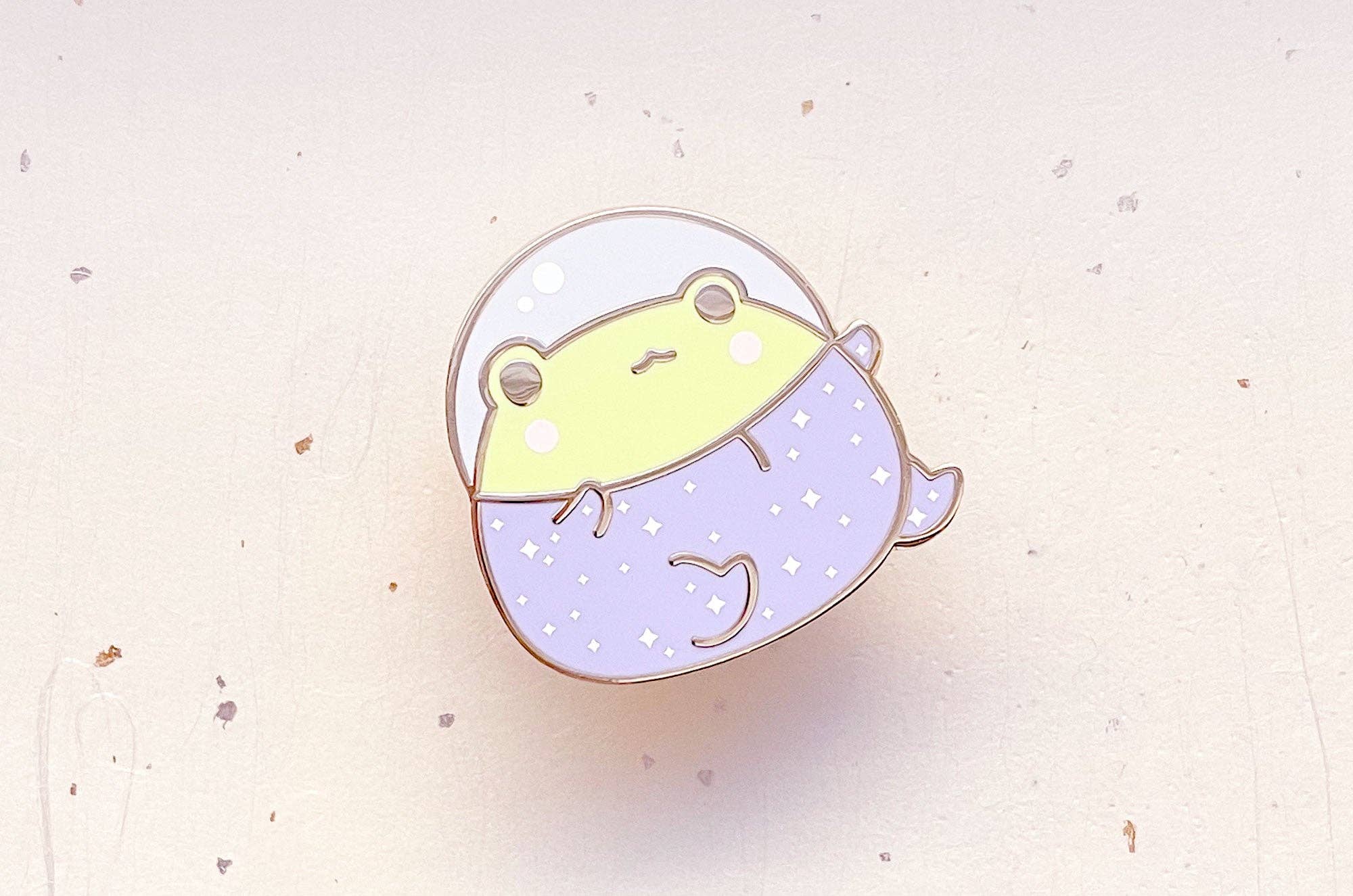This cute Space Frog Gogo enamel pin features my Gogo the Frog character floating in a starry spacesuit. This hard enamel pin is set on a highly-polished gold-plated metal with two posts on the back and measures around 1.25".