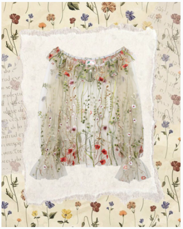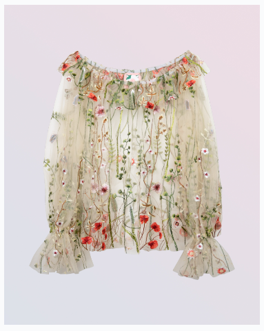 Relaxed fit embroidered mesh blouse with puffy sleeves and elastic in the cuff and neckline.
