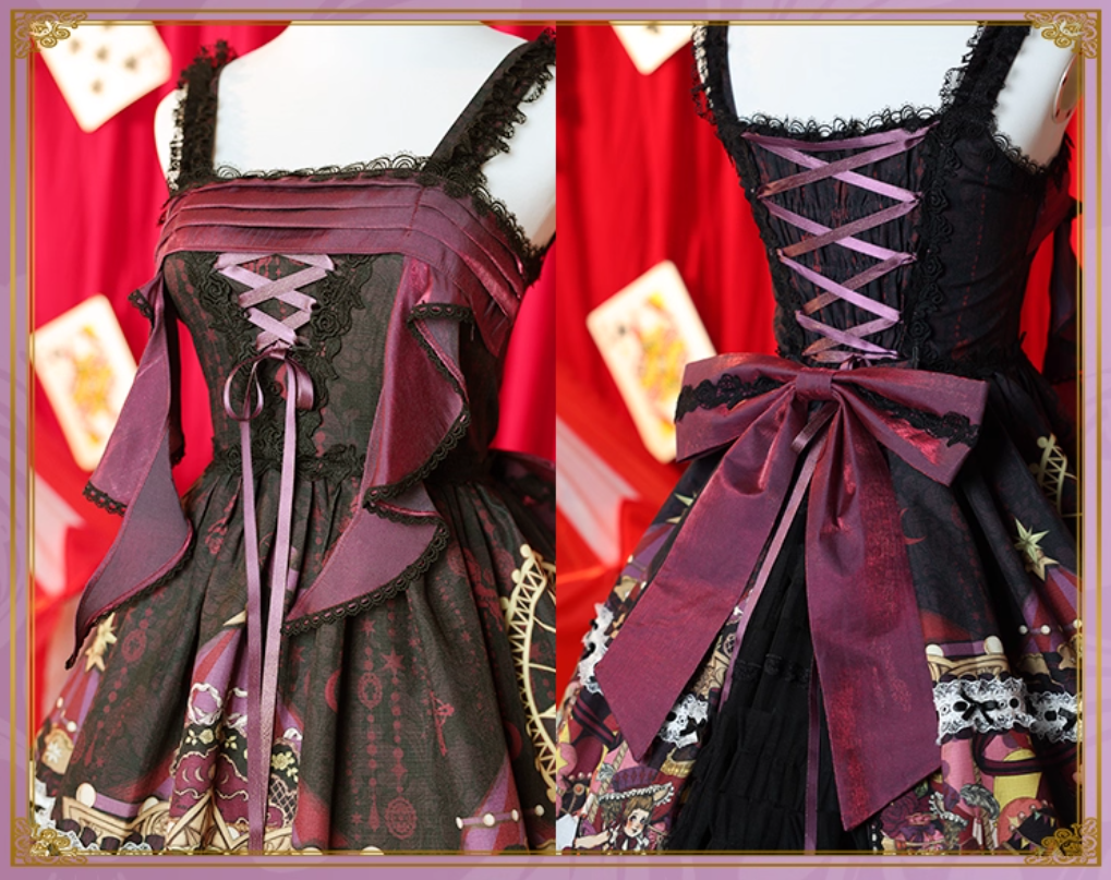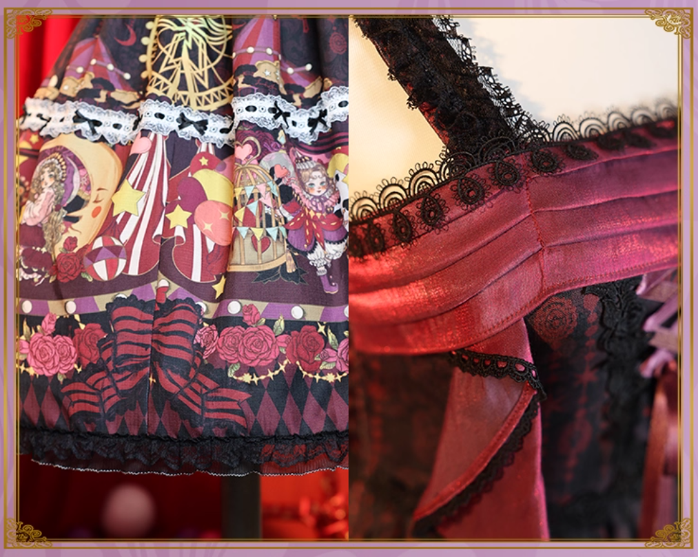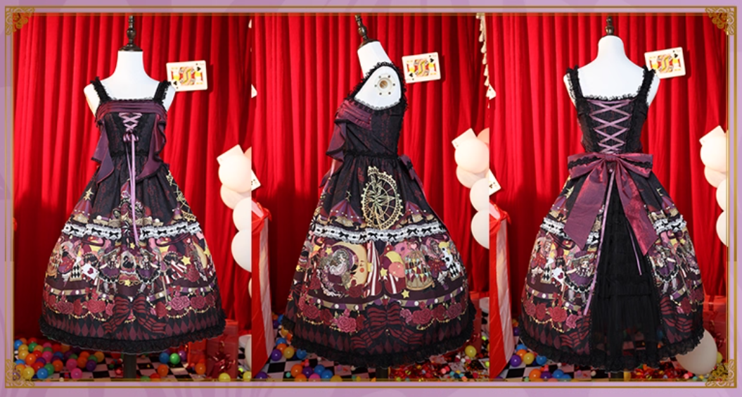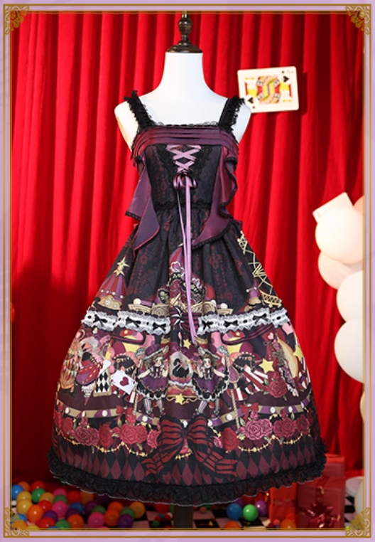 Welcome to the Fantas Circus! This beautiful jumperskirt by Fantasy Circus Lolita features a bold border print of card suits, a girl jester, roses, and a carnival backdrop. Available in four sizes, this jumperskirt is perfect for any carnival look!