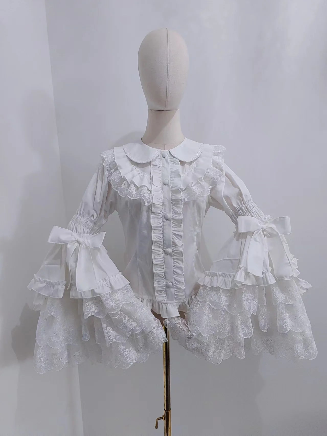 The bodice is detailed with layered ruffles and a full button-down front, creating depth and texture while maintaining a timeless elegant aesthetic. The sleeves are the true statement piece—voluminous trumpet sleeves that cascade into multiple tiers of ruffles, finished with oversized bows at the elbows for added charm.