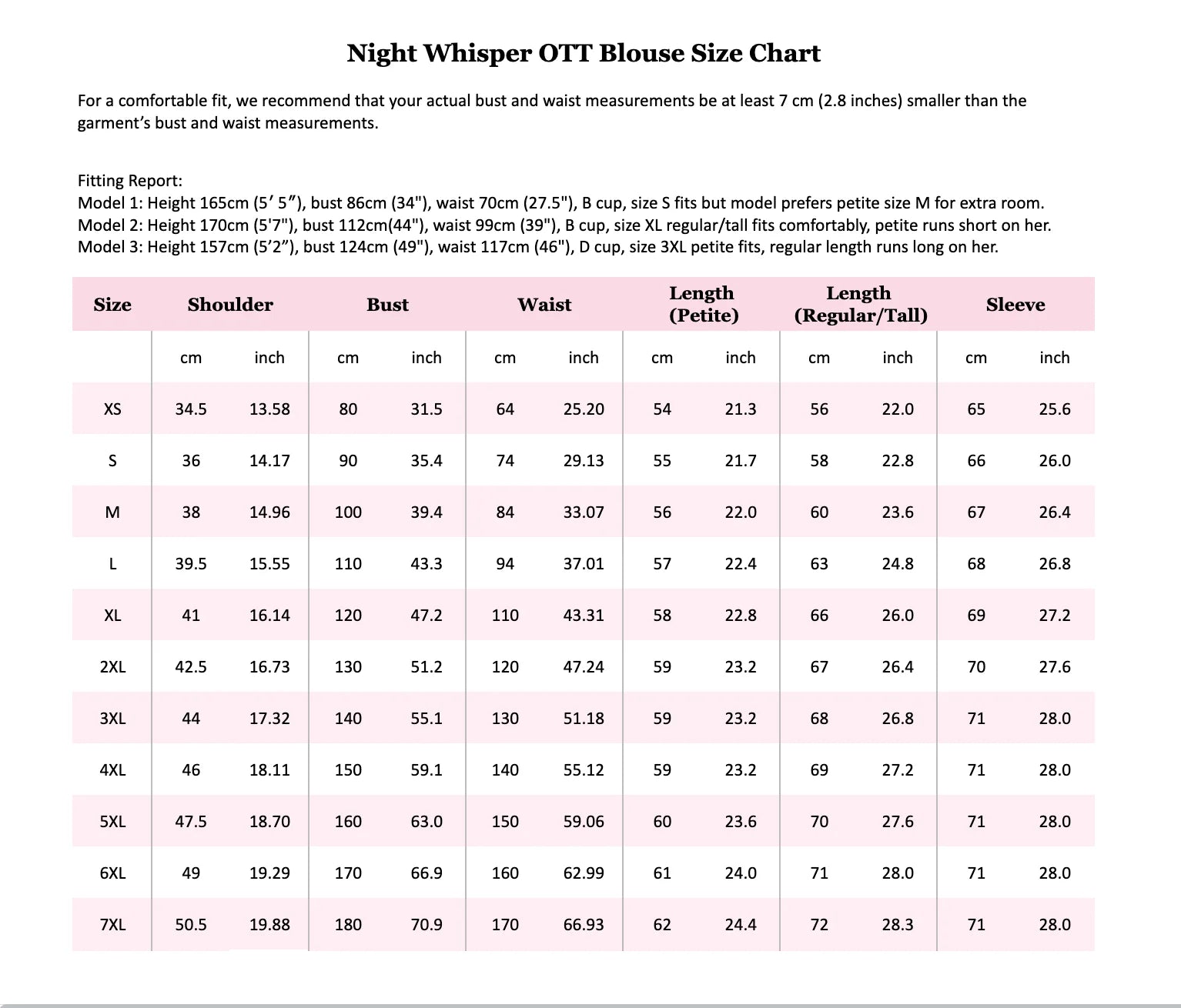 Model 1: Height 165cm (5′ 5″), bust 86cm (34"), waist 70cm (27.5"), B cup, size S fits but model prefers petite size M for extra room.