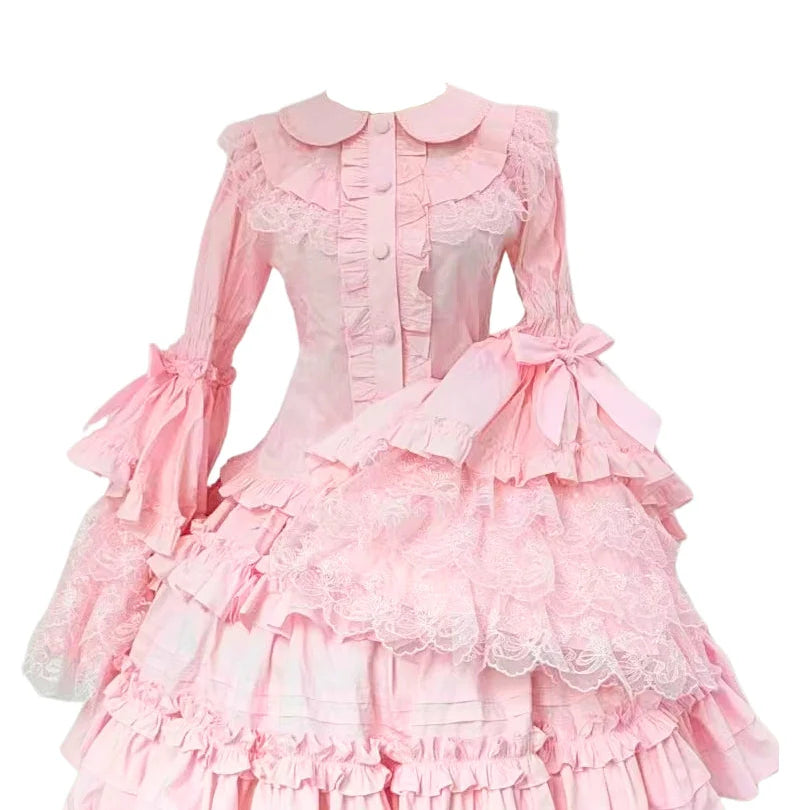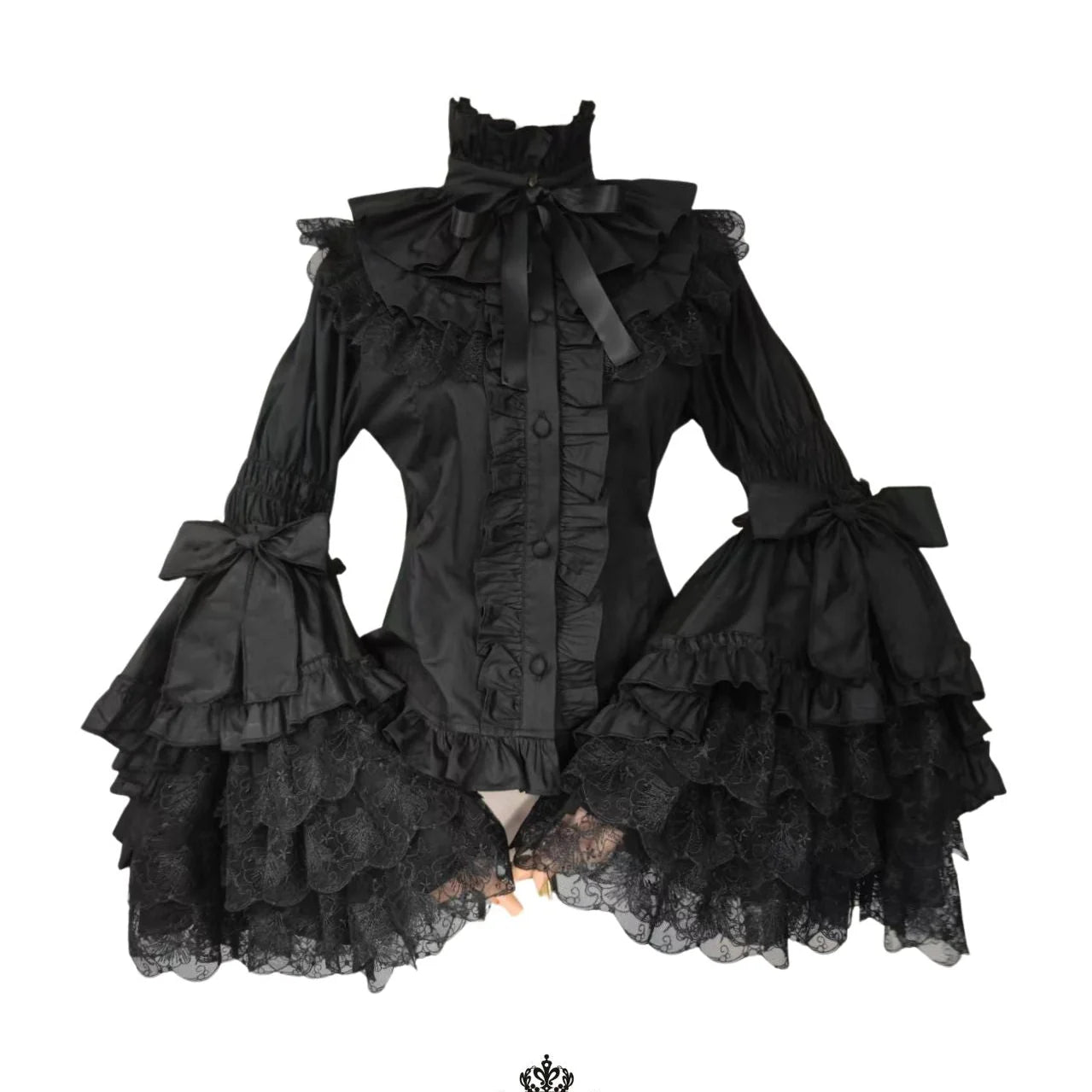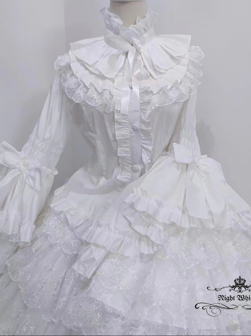 This elegant Gothic blouse is crafted from 100% cotton, offering a breathable yet structured silhouette perfect for classic and gothic Lolita styles. The design features a dramatic high ruffled collar adorned with a satin ribbon bow, adding a touch of Victorian refinement.