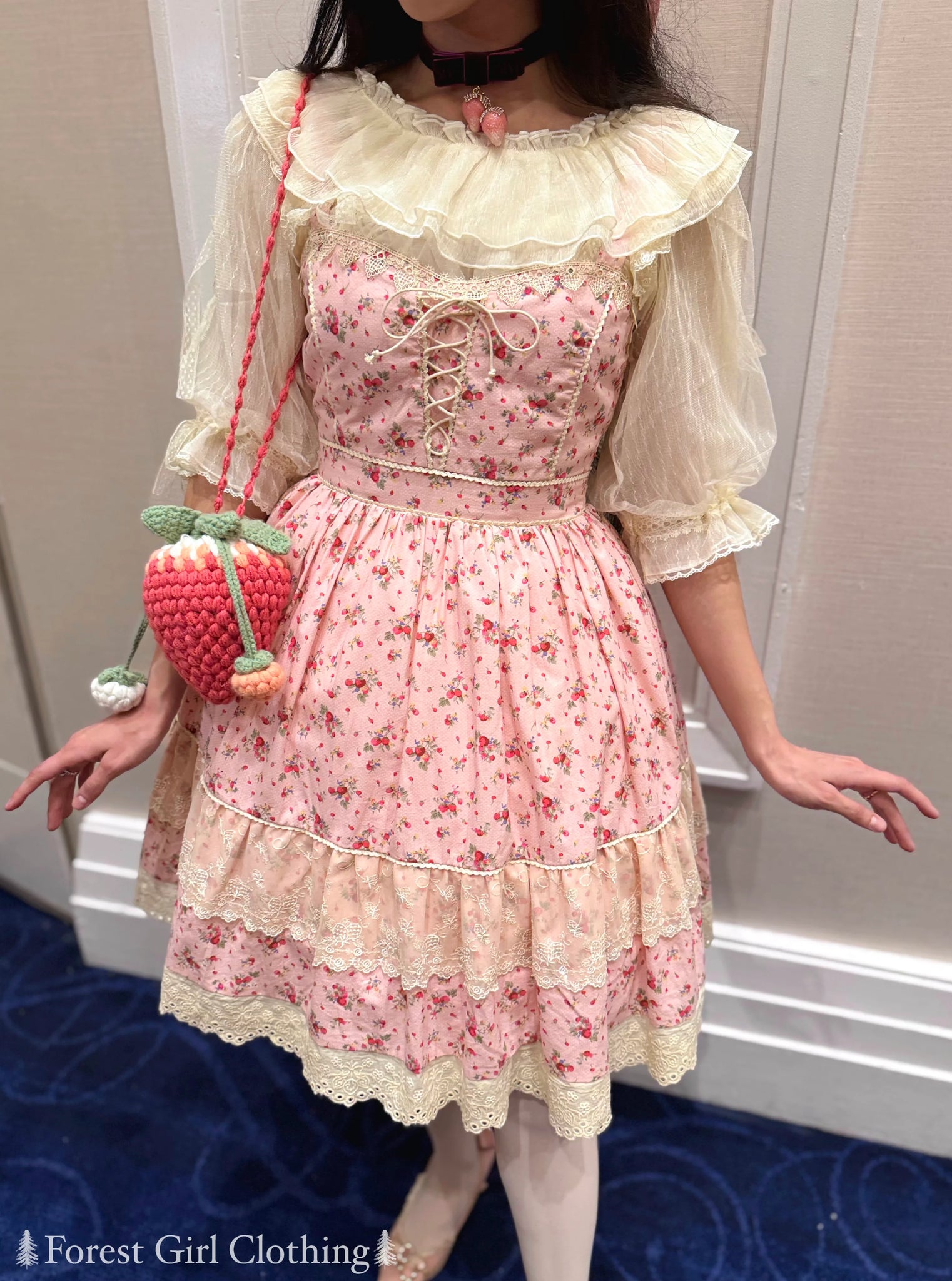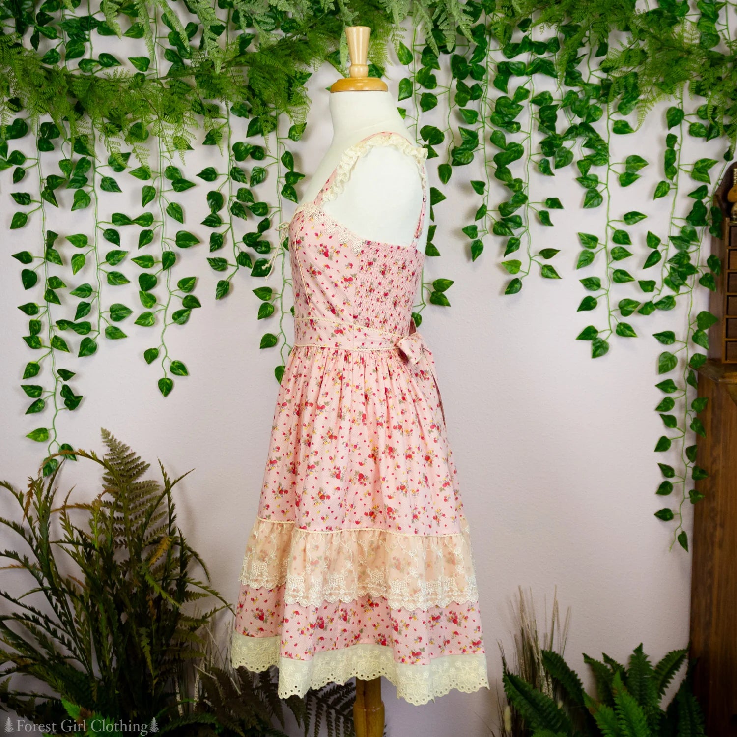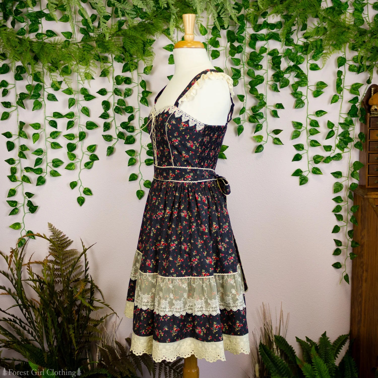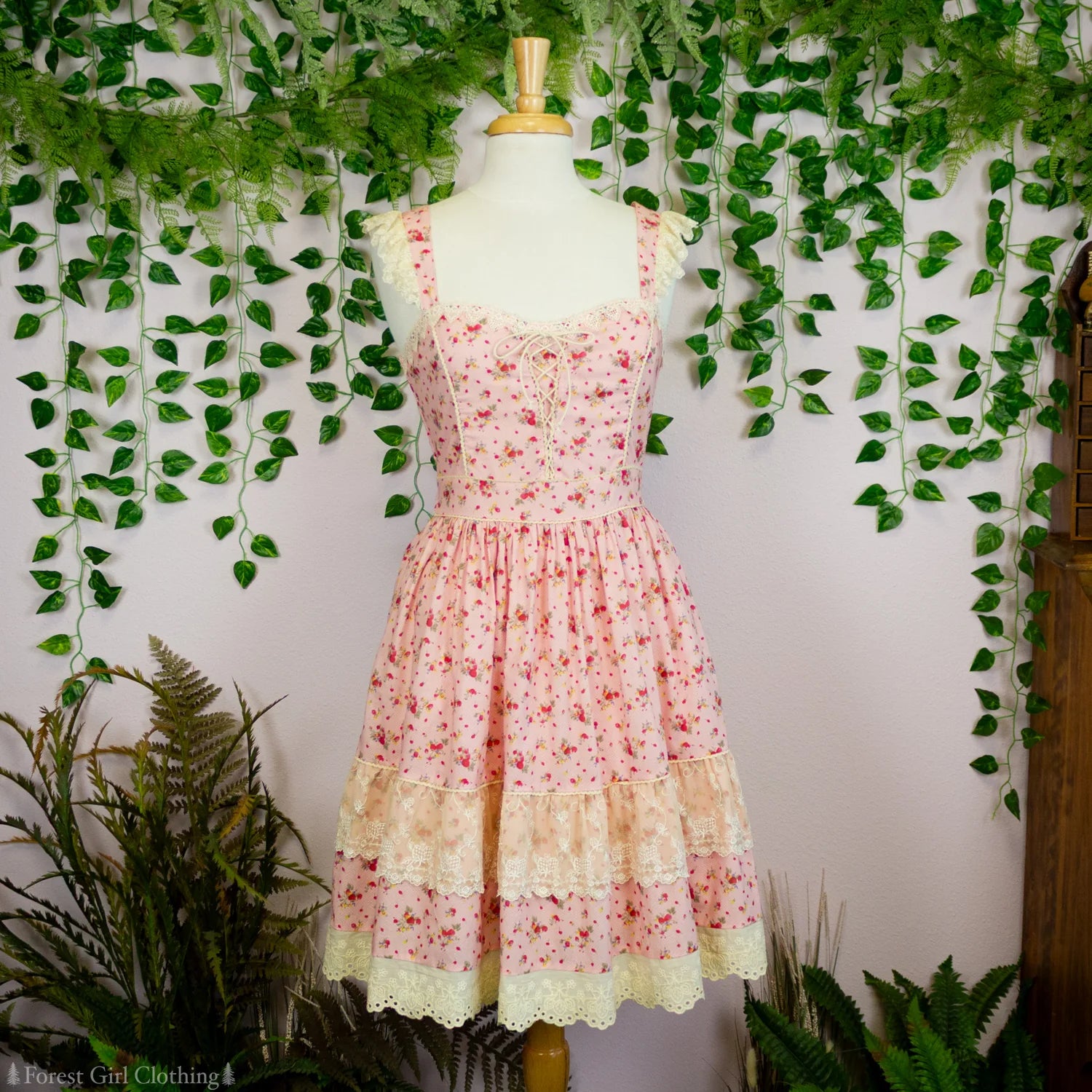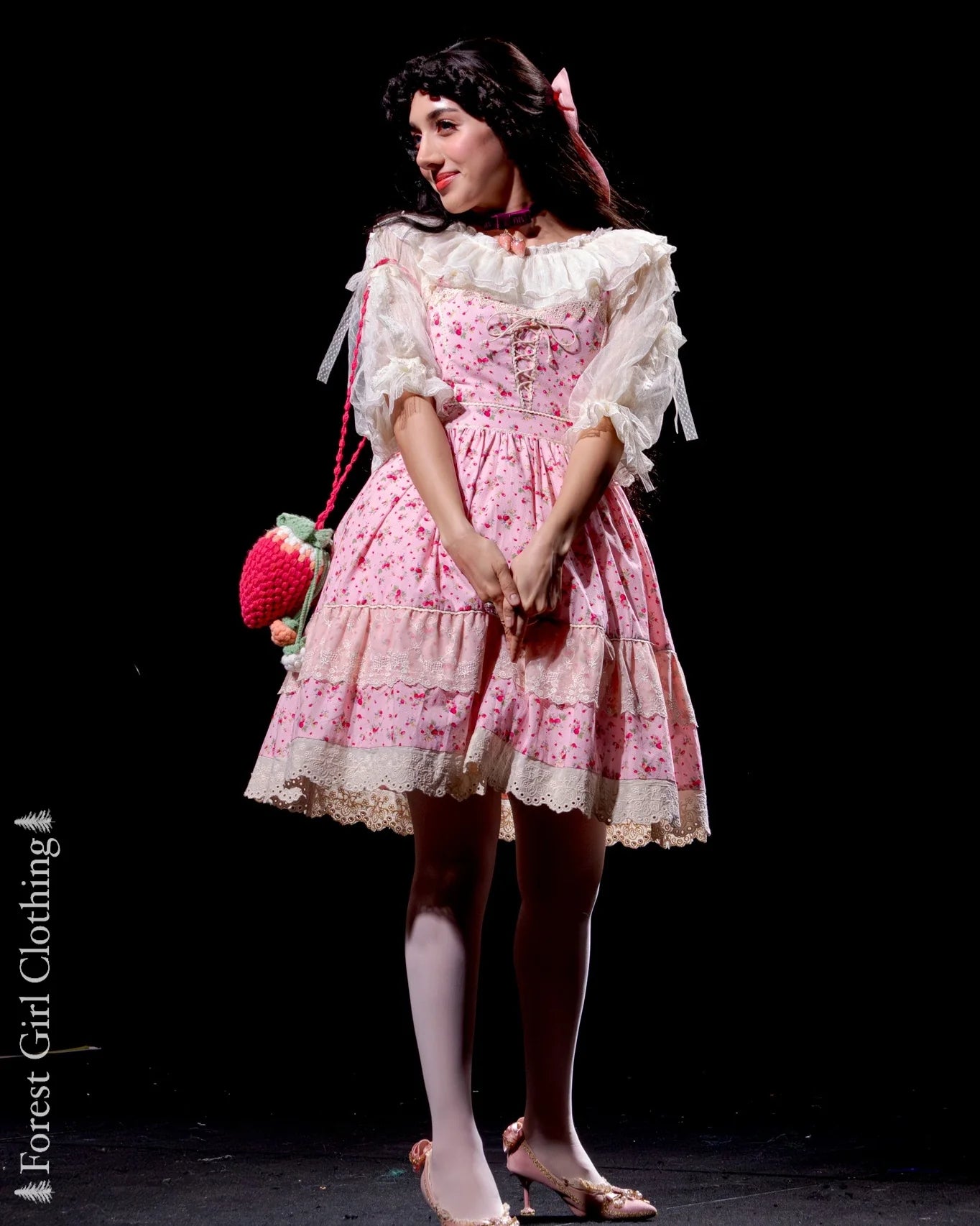 A dress as sweet as strawberries and cream! This summery sundress is made from cotton with an adorable strawberry print, and it is trimmed with three types of strawberry lace!