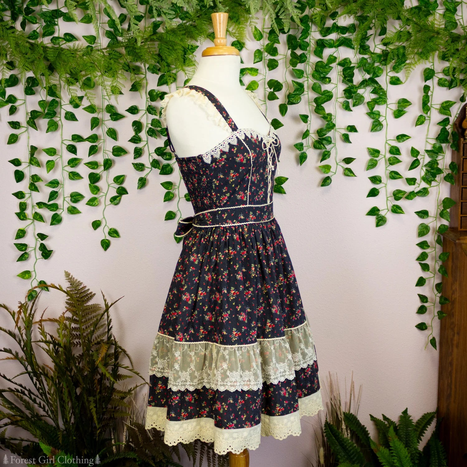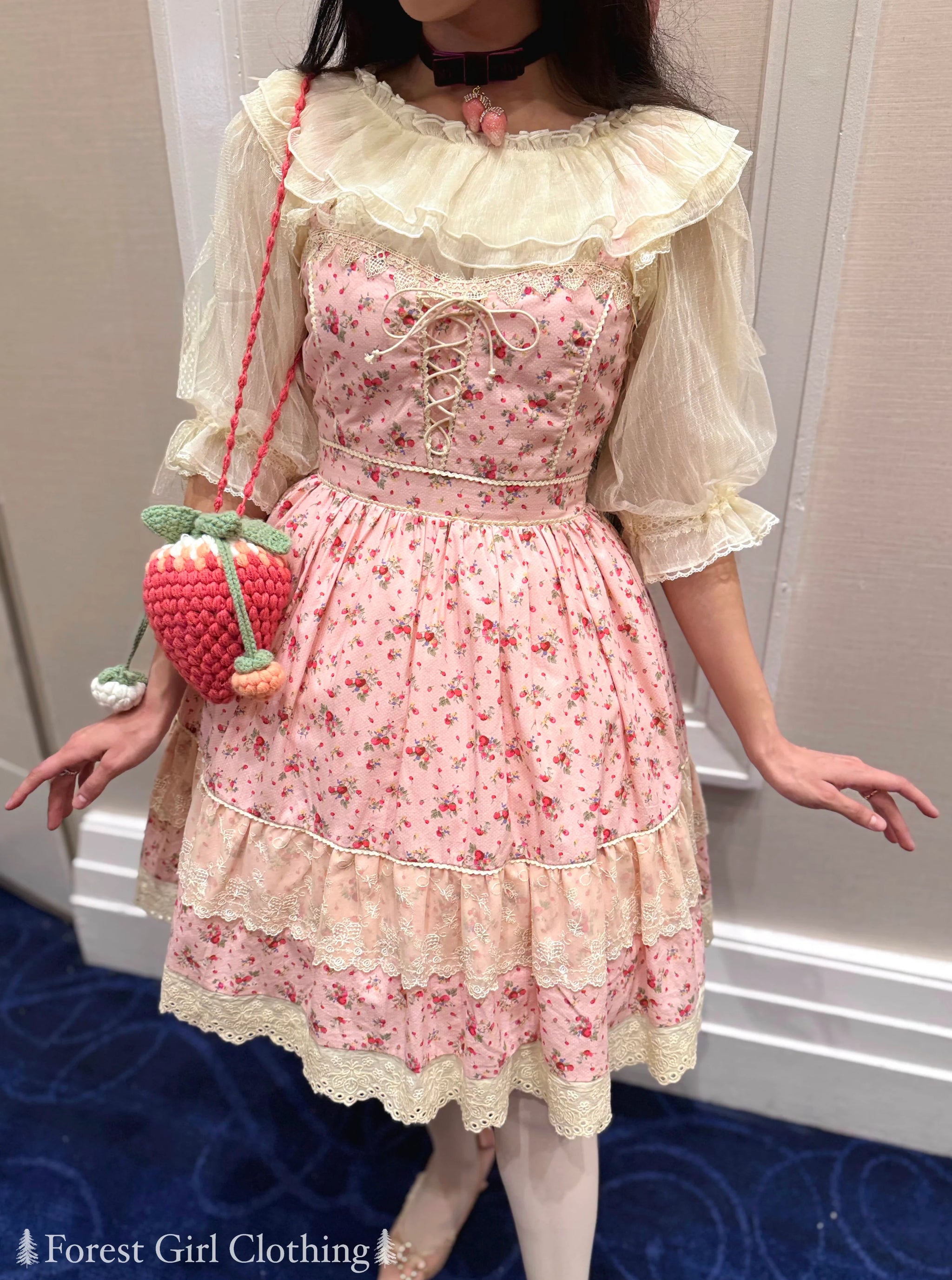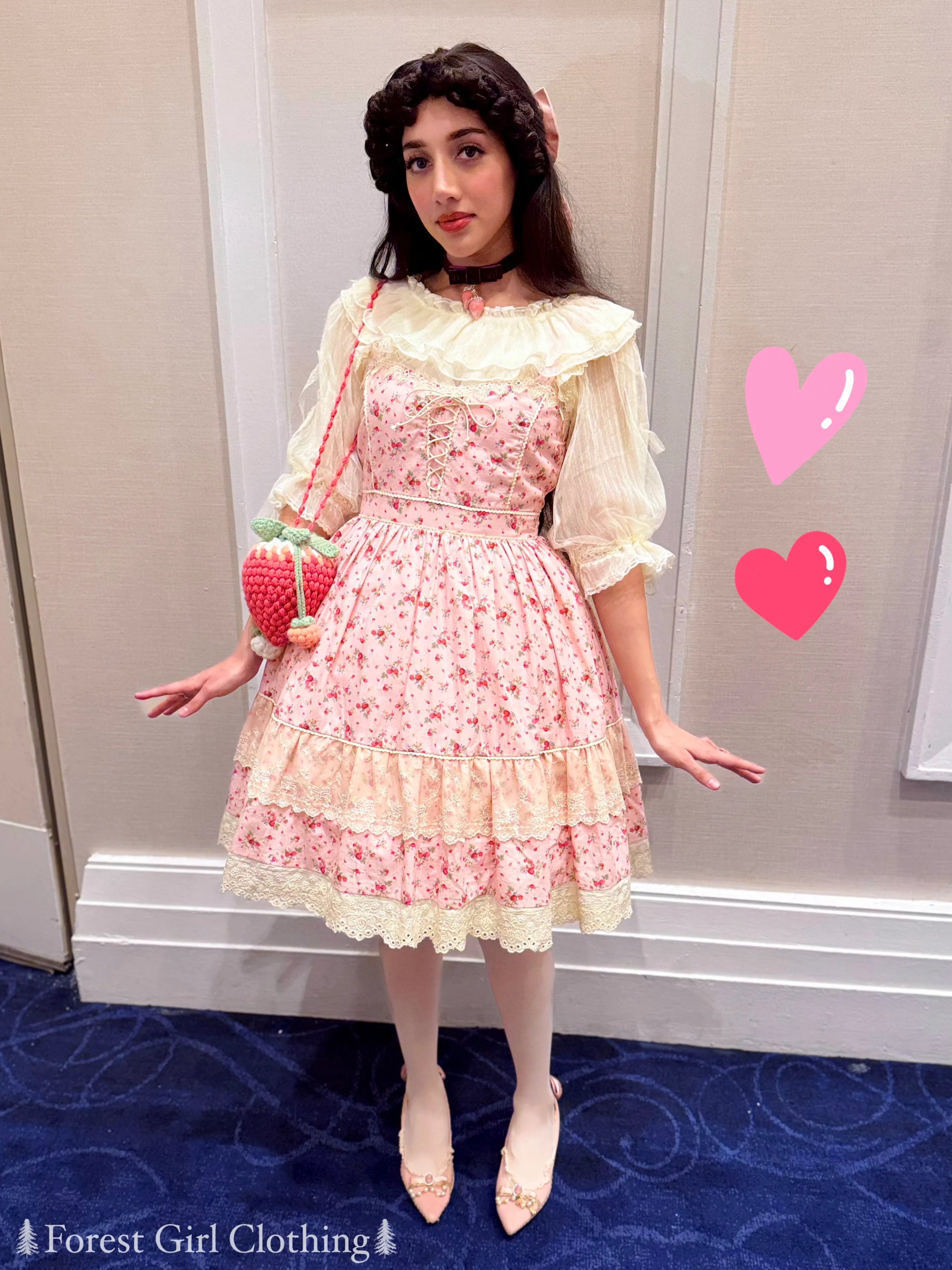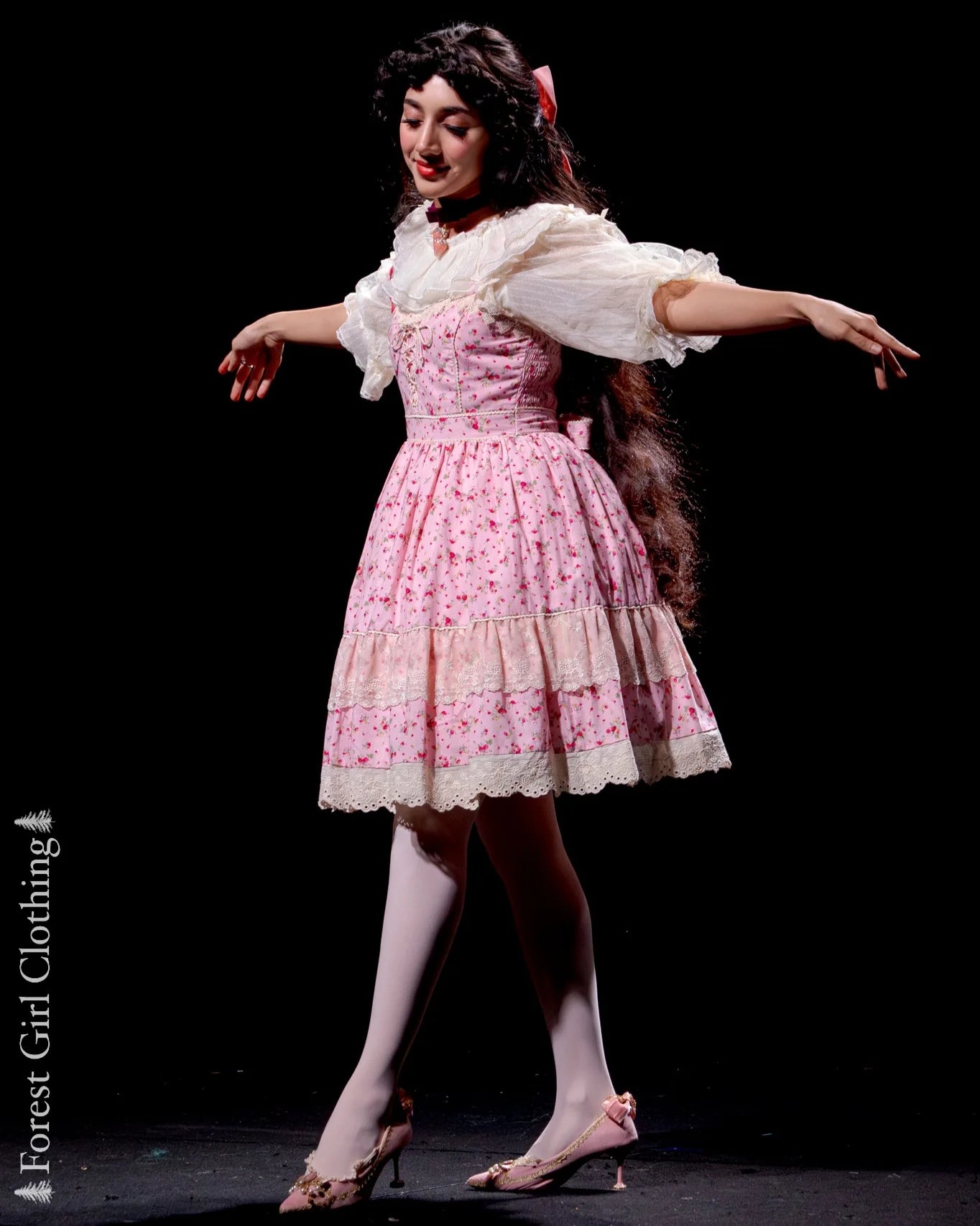 A dress as sweet as strawberries and cream! This summery sundress is made from cotton with an adorable strawberry print, and it is trimmed with three types of strawberry lace!
