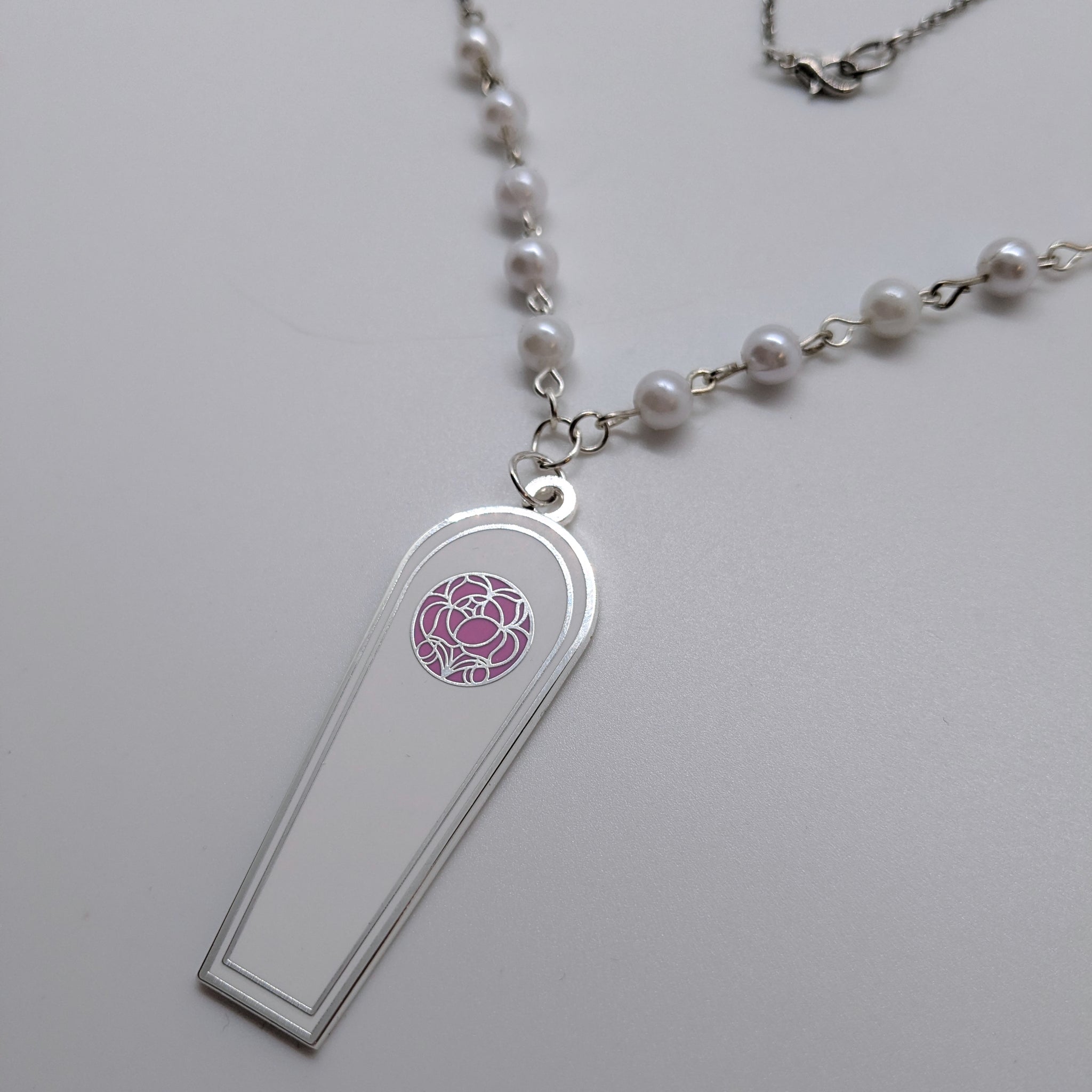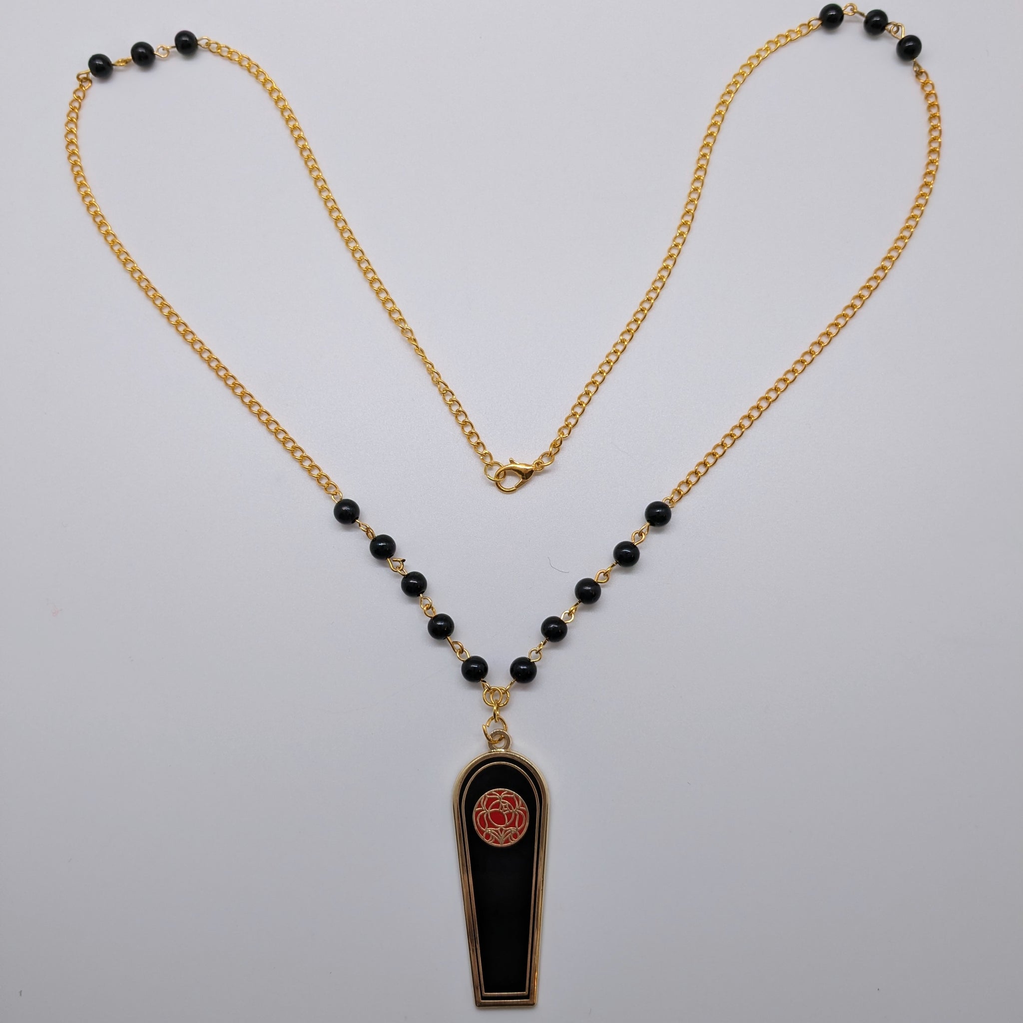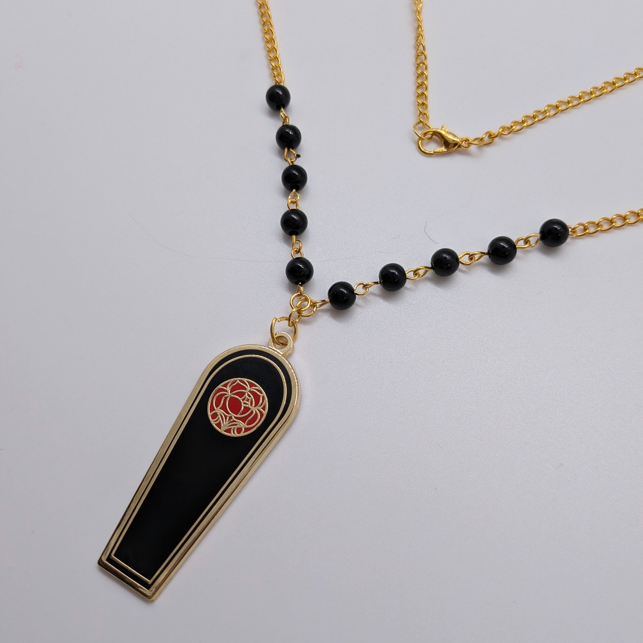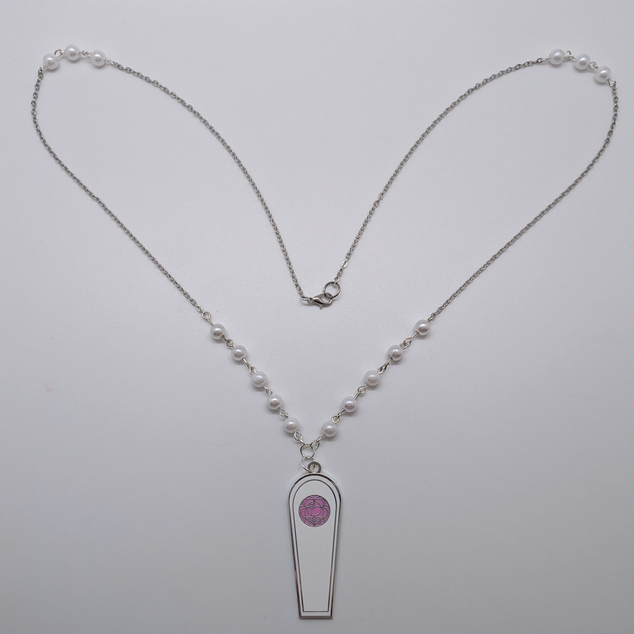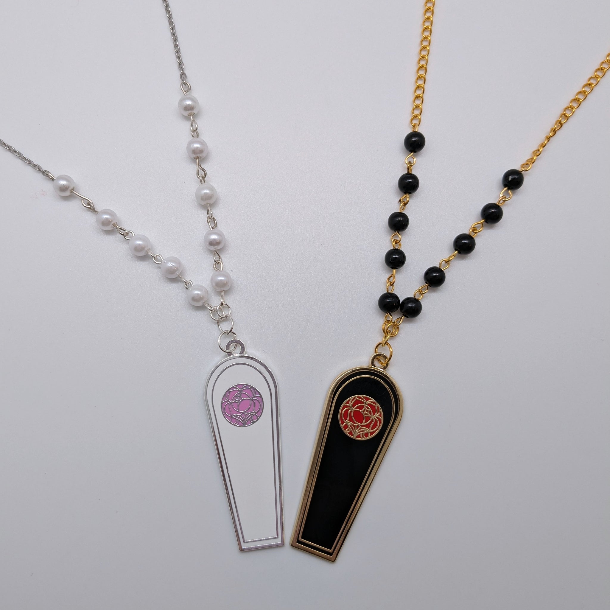 Revolutionize your wardrobe with this stunning, lavalier style necklace from starcrossed lovelies! These beautiful coffin pendants feature a stylized Rose Seal from Revolutionary Girl Utena, and hang from a hand beaded chain. The black version features a black coffin with a red rose seal and black beads. The white version features a white coffin with a pink rose seal and white beads. The coffin pendant measures roughly 2 inches long. The beaded chain measures roughly 28 inches long.